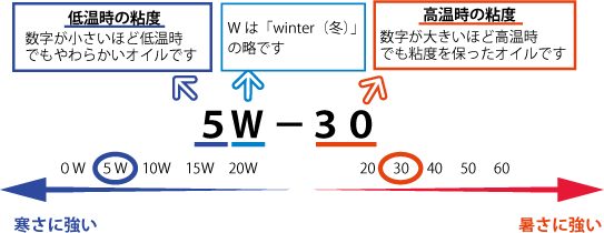 オイルにはSAE規格という、「オイルの粘度」を定めた規格として広く普及しているものがあります。 例えば「5W-30」と表記されているものについて見ていくと頭にある「5W」の数字が小さければ小さいほど、低温時でも柔らかいオイルであることを意味します。つまり、朝一のエンジンの始動性が良いことや、低粘度のため燃費が良いという特徴があります。 また後ろの数字は高温時の粘度で、高ければ高いほど