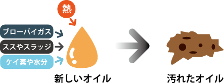 エンジンオイルは使用するにつれて「すす・酸化物」「熱」等によって汚れ、劣化します。