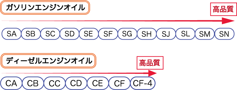 「ガソリンエンジン用オイル」なら「SA」~「SM」までのグレードに分けられ「ディーゼルエンジン用オイル」なら「CA」~「CJ-4」までのグレードに 分類されています。