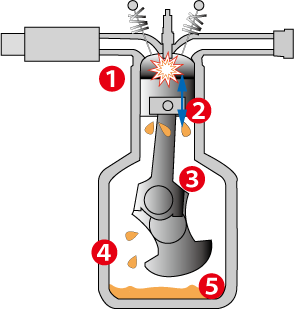 機密が不十分だと燃焼によって作られたエネルギーが隙間から逃げてしまい、「パワーロス」や「ブローバイガス排出」の原因にも なります。そのため、エンジンオイルによって気密性を保つ必要があります。