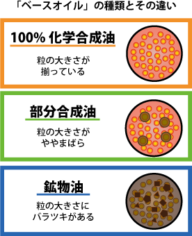 鉱物油を化学分解してエンジン洗浄と環境を考えた添加剤を化学合成させた良質なオイル。成分や分子量を一定にしたもので、コストは高いが安定した高性能を発揮する。